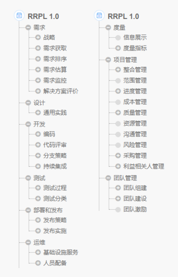 目前1.0版本已经覆盖需求、设计、开发、测试、发布、运维、度量、项目管理、团队管理等项目生命周期各个阶段,重点关注落地的实践层级。