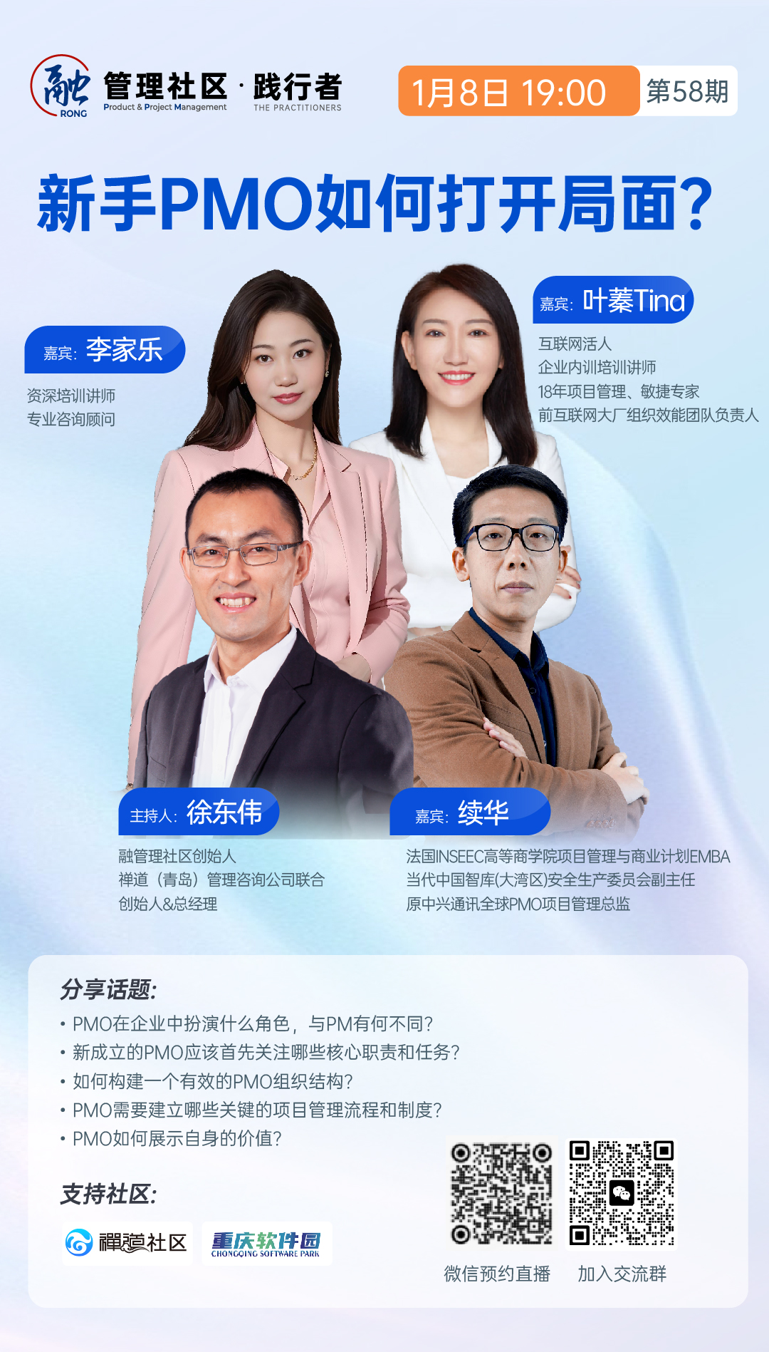 更有PMO实践白皮书重磅发布!扫描海报上的二维码,1月8日(周三)晚7点,让我们一起去听听新手PMO如何打开局面?