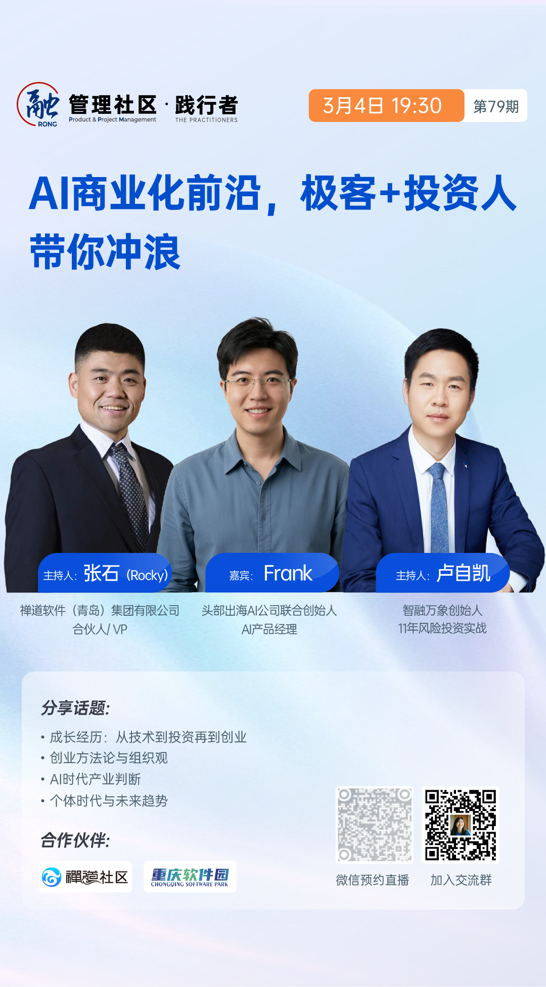 3月4日(周三)晚7点30分,锁定践行者直播间,听Frank、卢自凯、张石(Rocky)三位老师,分享AI时代真正的生存法则。