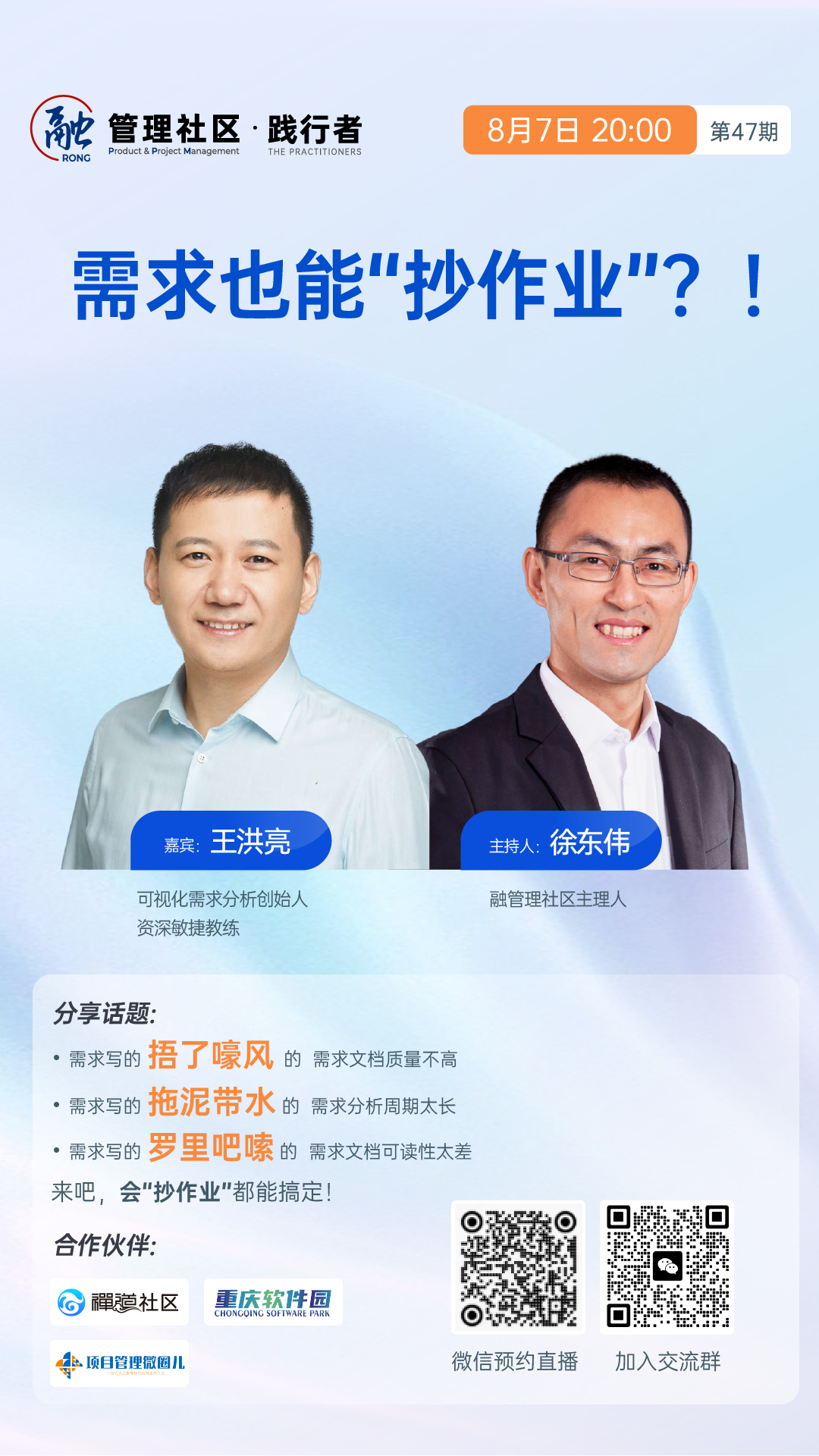扫描海报上的二维码,8月7日(周三)晚8点,让我们一起来听听王洪亮老师关于需求的分享。