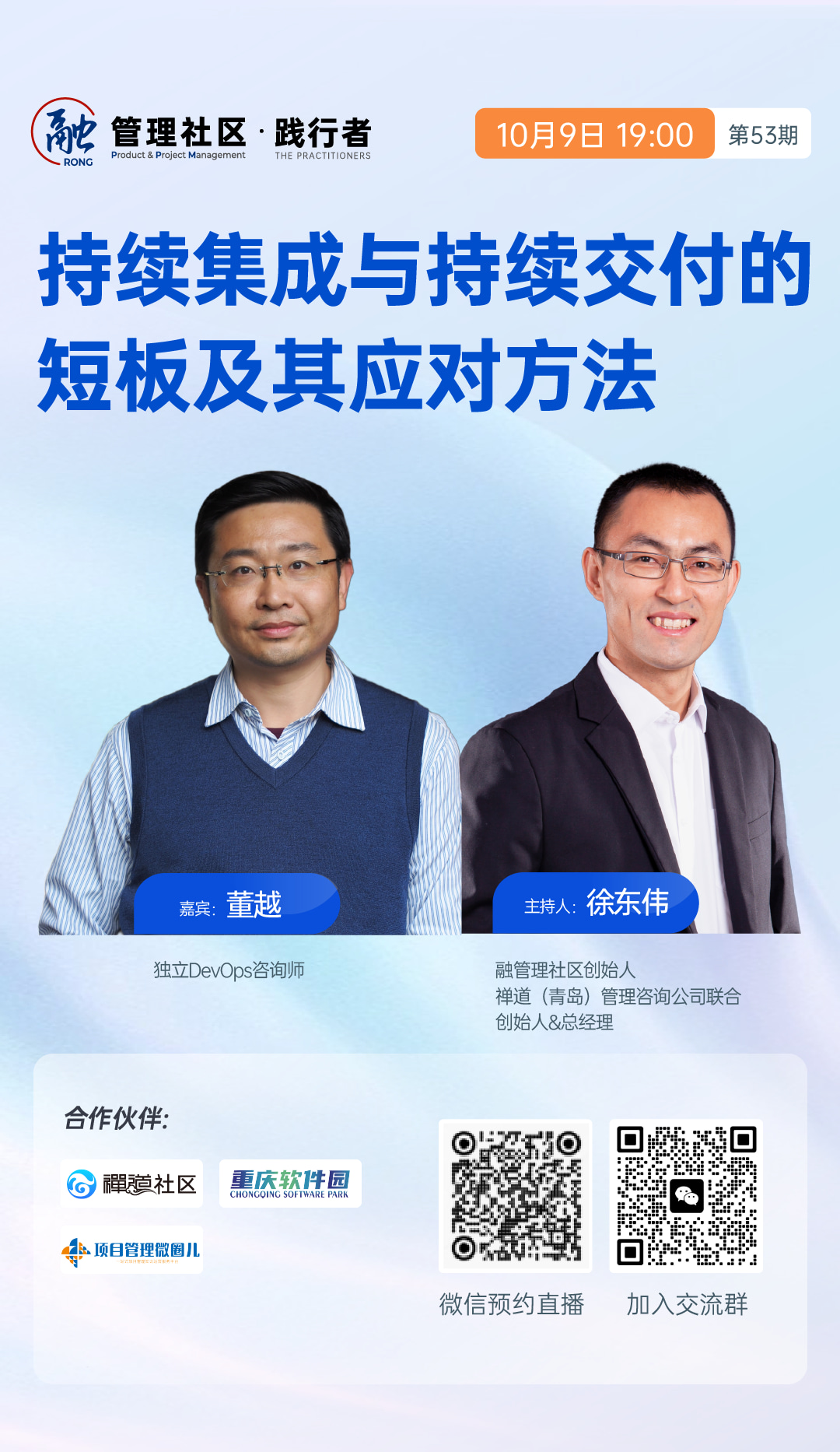 扫描海报上的二维码,10月9日(周三)晚7点,让我们一起去听听董越老师分享持续集成与持续交付的短板及其应对方法。