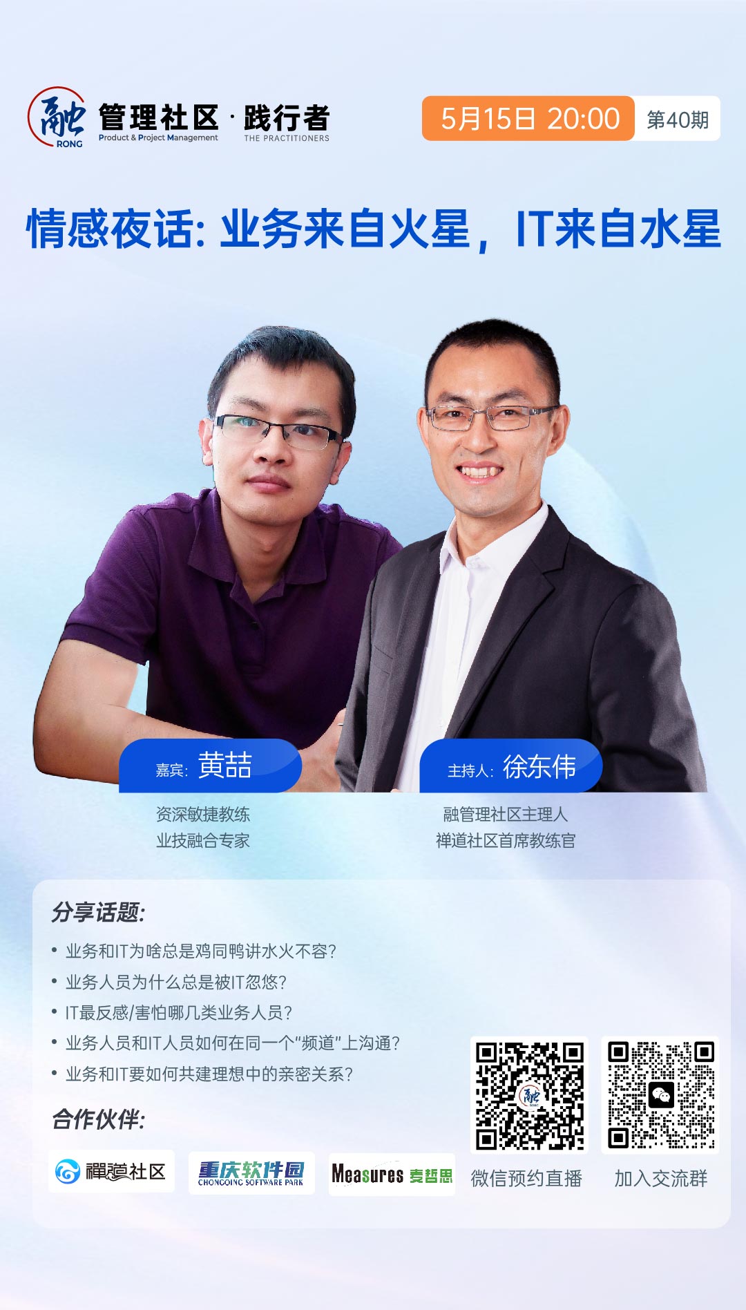 扫描海报上的二维码预约,5月15日晚8点,和我们一起来践行者直播间聊聊如何看待业务来自火星,IT来自水星吧!