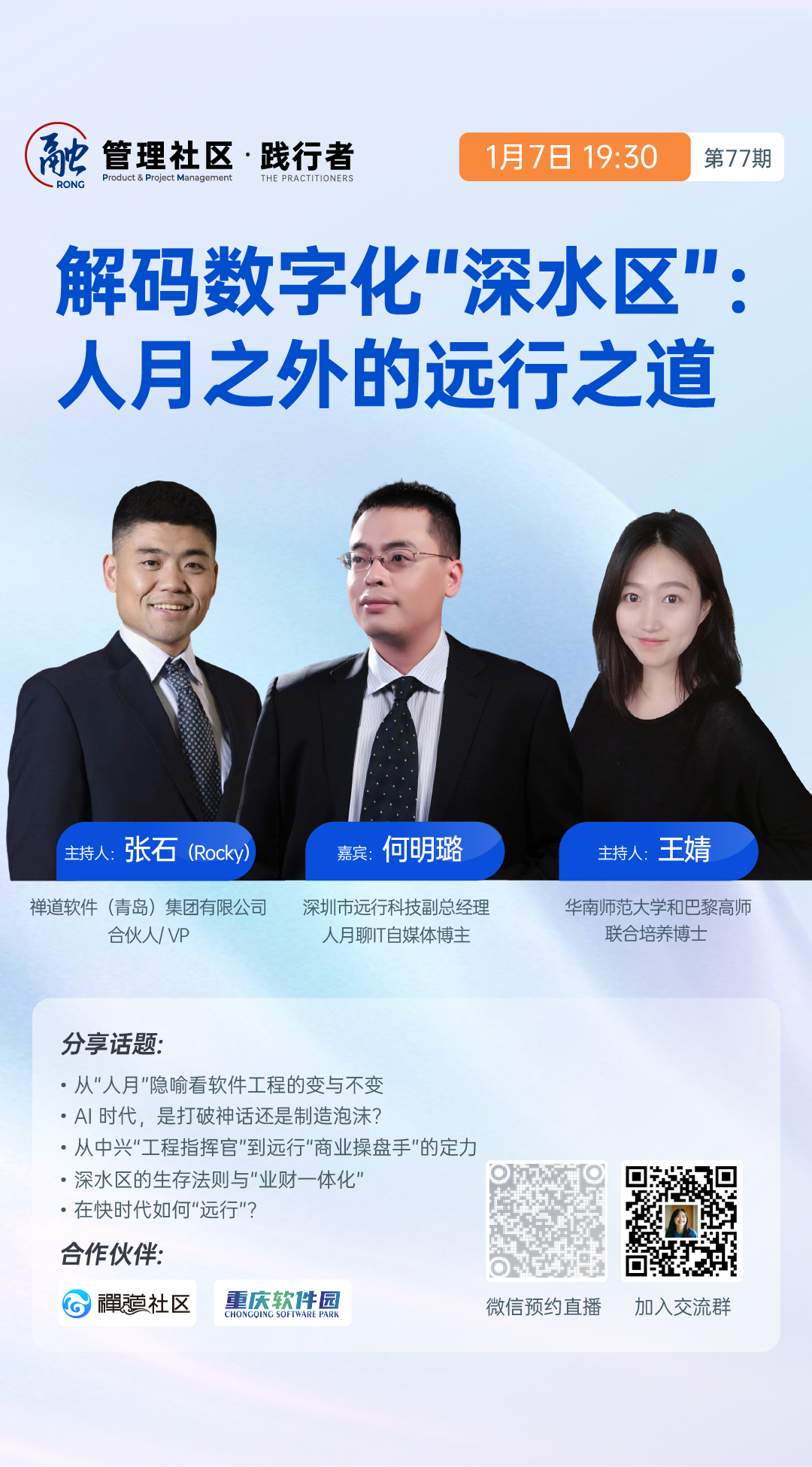 1月7日(周三)晚7点30分,锁定践行者直播间,听深圳市远行科技副总经理、人月聊IT自媒体博主何明璐老师分享从"人月"隐喻看软件工程的变与不变。