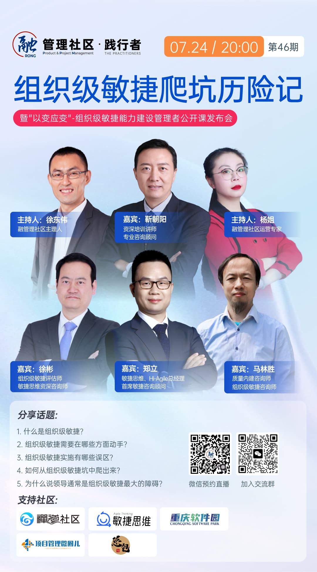 扫描海报上的二维码,7月24日(周三)晚8点,让我们一起来听听四位老师关于组织级敏捷爬坑历险记的故事。