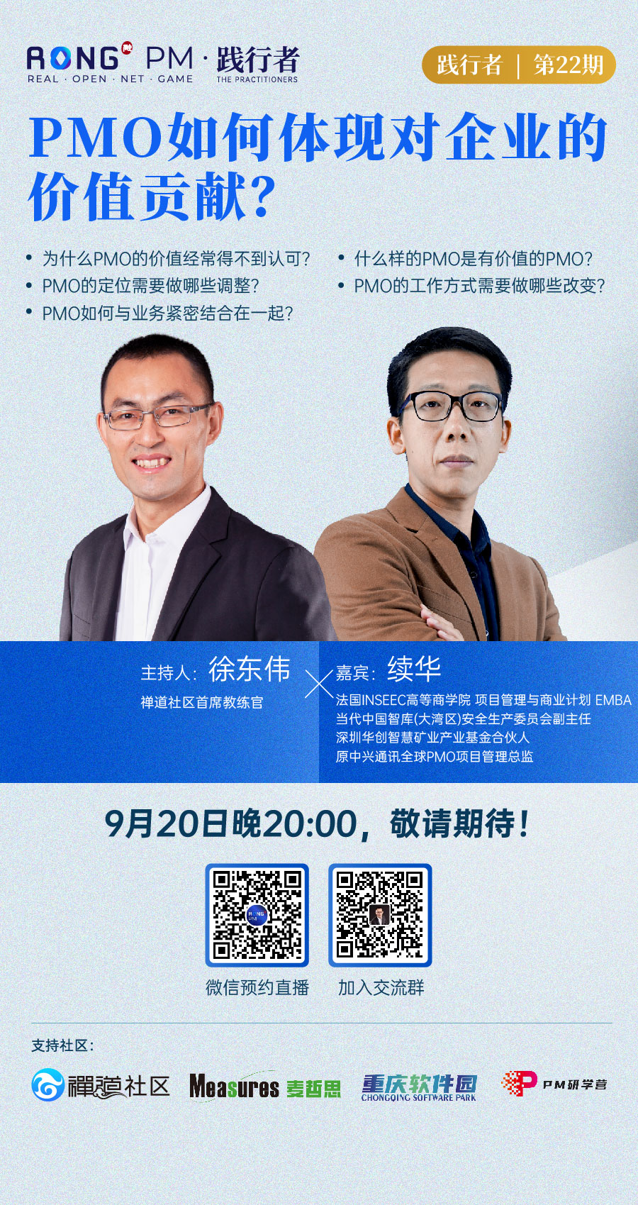9月20日(本周三)晚20:00,让我们和组织级项目管理/PMO咨询顾问续华老师一起聊聊,PMO如何体现对企业的价值贡献?