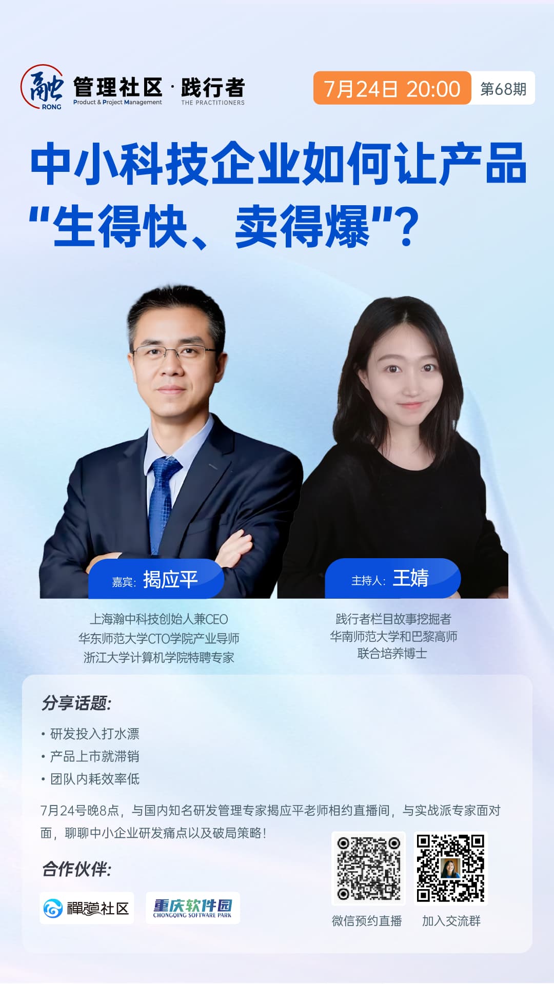 7月24号(周四)晚8点,与国内知名研发管理专家揭应平老师相约直播间,与实战派专家面对面,聊聊中小企业研发痛点以及破局策略!