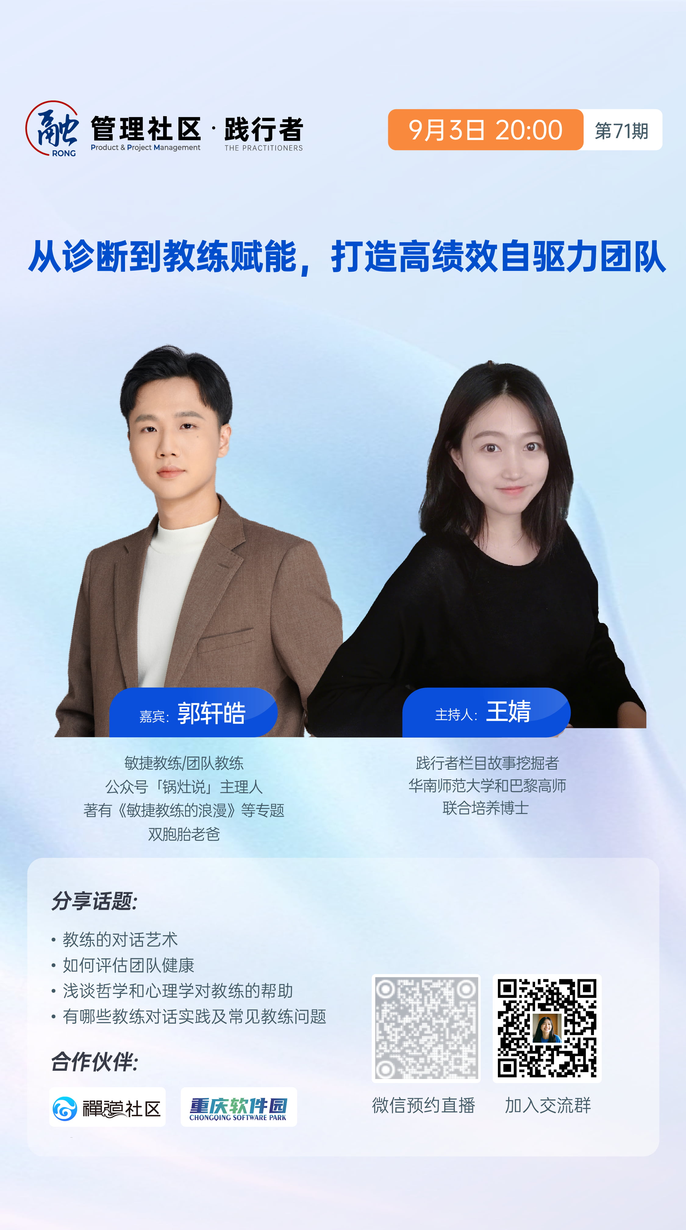 9月3日(周三)晚8点,锁定践行者直播间,探寻教练工作的真实道场,聊聊那些关于团队、成长与修行的干货。