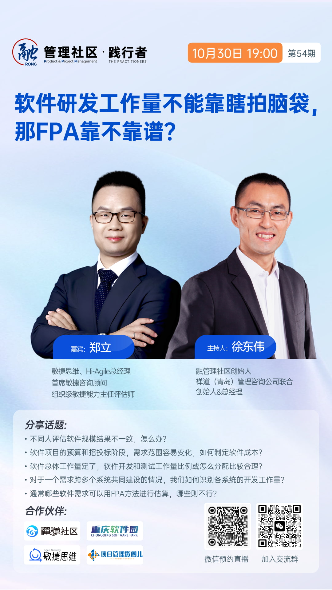 扫描海报上的二维码,10月30日(周三)晚7点,让我们一起去听听郑立老师分享软件研发工作量,FPA靠不靠谱呢?