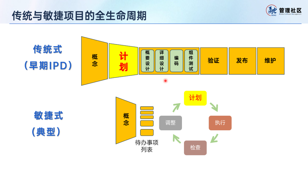 ● 传统项目管理:一种计划驱动的项目管理方法,它基于预定范围来定义和执行项目计划。强调按计划执行,严格管理变更和偏离;