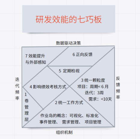A:研发效能的关键是要建立持续反馈的机制,能够牵引团队,比如下图中研发效能七巧板中的定期检视和正向反馈:
